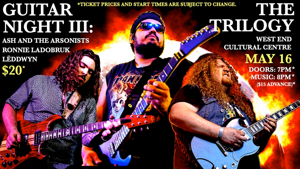 Join Ash And The Arsonists, Ronnie Ladobruk and Lëddwyn for an evening of ripping riffs, shredding solos and all manner of face-melting six-string acrobatics courtesy of three of Winnipeg’s greatest guitar players. All ages, one night only.